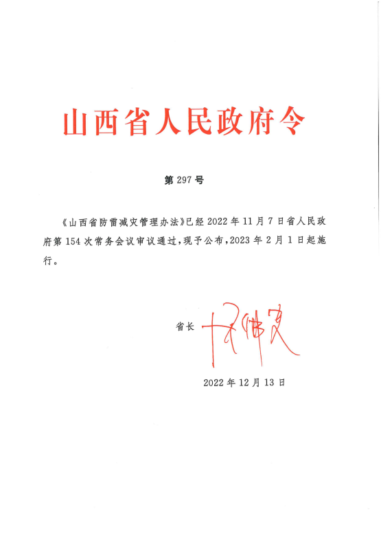 山西省防雷減災(zāi)管理辦法(山西省人民政府令第297號)
